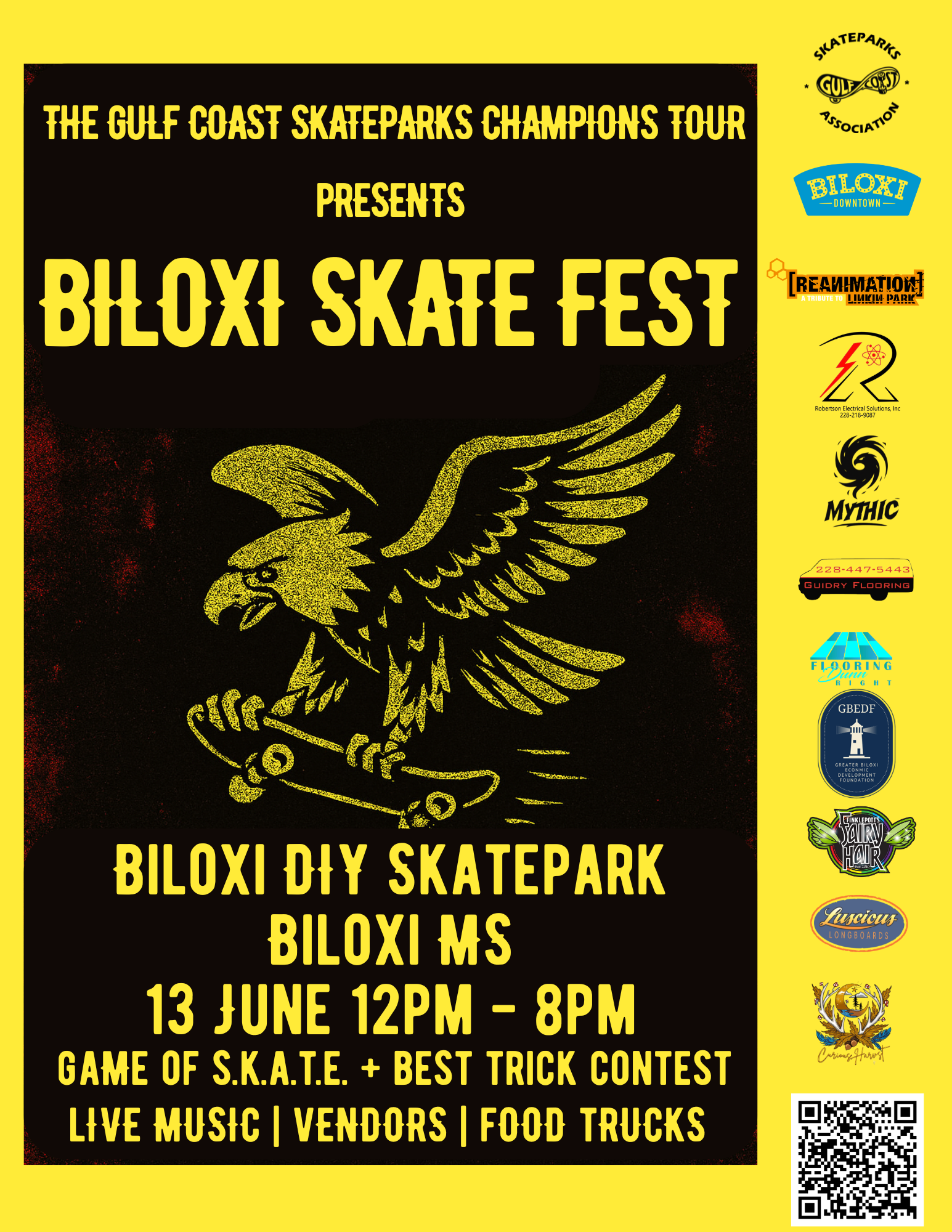 Biloxi Skate Fest! Biloxi DIY Skatepark, Biloxi, MS 11 April | 5PM–7PM Game of Skate Tournament + Best Trick Contest + Live Music + Vendors